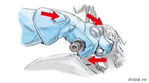 もちろんこのRIDE HIの記事やYoutubeでブレーキングについて解説しているように、ブレーキレバーの遊びをジワッと引くことによってキャンセルし、ローターにパッドが触ったのを感じる面圧が発生するストローク位置から、減速のための入力調整する操作が大前提です。