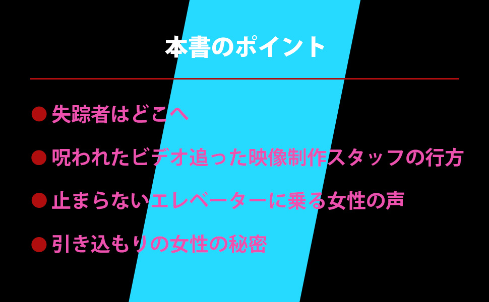 今回の書籍は、この人行方不明のテーマのもと、チャンネル内で再生回数の多い、 『封印されたフェイクドキュメンタリー』『-(basement)-BASEMENT』『フィルムインフェルノ』『Sanctuary』等をもとにしたホラー短編集。