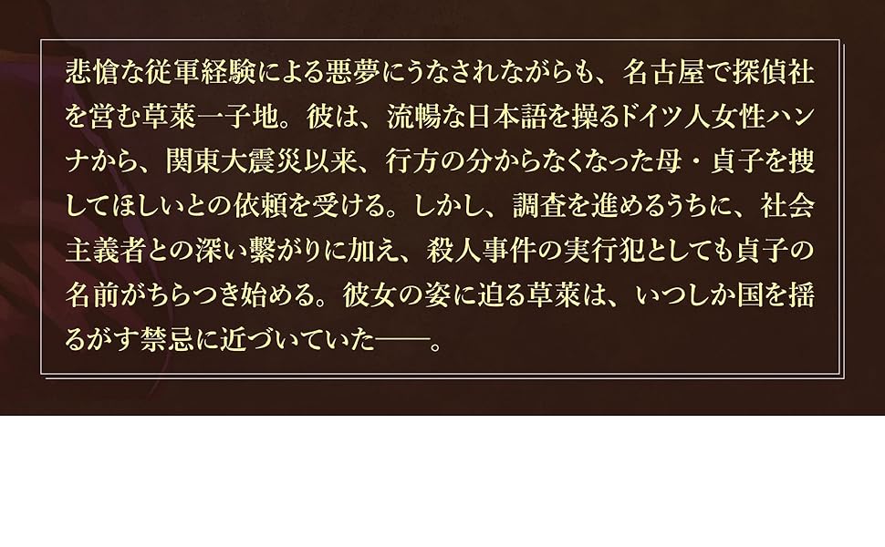 関東大震災(大正12年)後の日本。探偵、草?は、獨逸から来た女、ハンナ・ベルリナァの訪問を受け、行方不明者の捜索を依頼されます。大正ハードボイルドとでも呼ぶべき仕上がりではありますが。