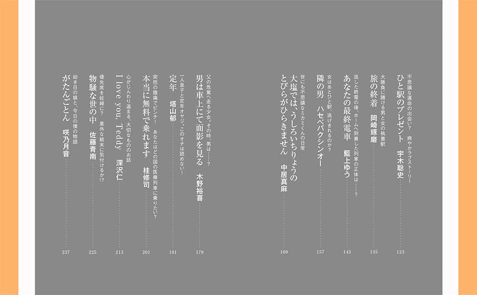 駅から駅までの間で起こる物語を乗車編・降車編に分かれて総勢43名の作家が描きます。