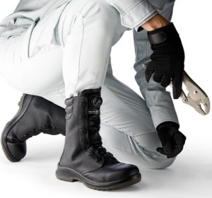スネまで覆われた長い靴です。蒸気や高温部への直接接触から皮膚を守るとともに、ズボンの裾を収納することで引っかかりも防止できます。