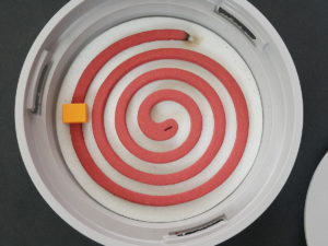 どんどん燃えている蚊取り線香ですが、このオレンジのキューブを超えることなくここで火が消える仕組みなんです。