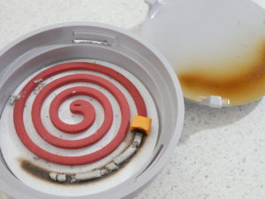 火がとまった蚊取り線香はこんな感じですが、蓋の色を見てください。 茶色く変色しています。