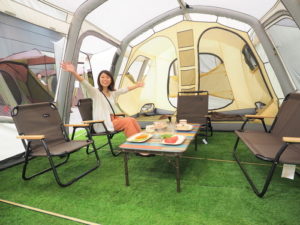 前面をタープとして使ったり、車と連結させたりすることも可能です。