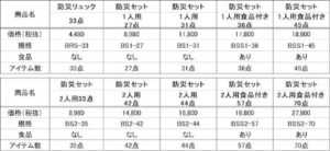 また10製品中の9製品で、セット内容を見直し、避難に役立つ4カテゴリ(飲食料品/衛生・寝具/電気/作業)の商品を組み替えています。