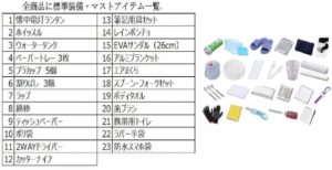具体的には、避難に不可欠なマストアイテム(簡易トイレ、ウォータータンク、懐中電灯など全23点)を標準装備としました。