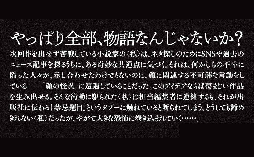 このアイデアならば凄まじい作品を生み出せる。そんな衝動に駆られた「私」は担当編集者に連絡するも、それが出版社に伝わる「禁忌題目」というタブーに触れていると断られてしまう。