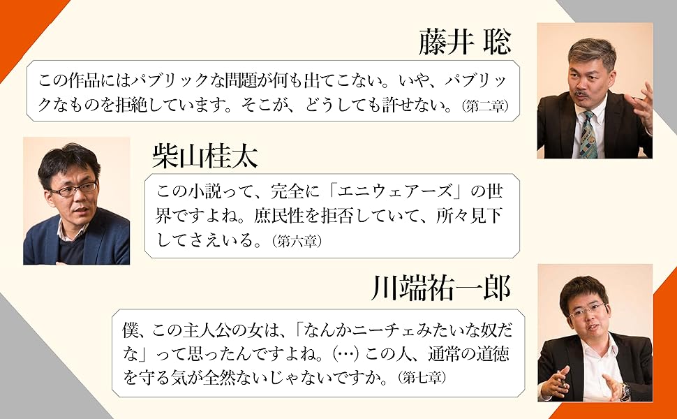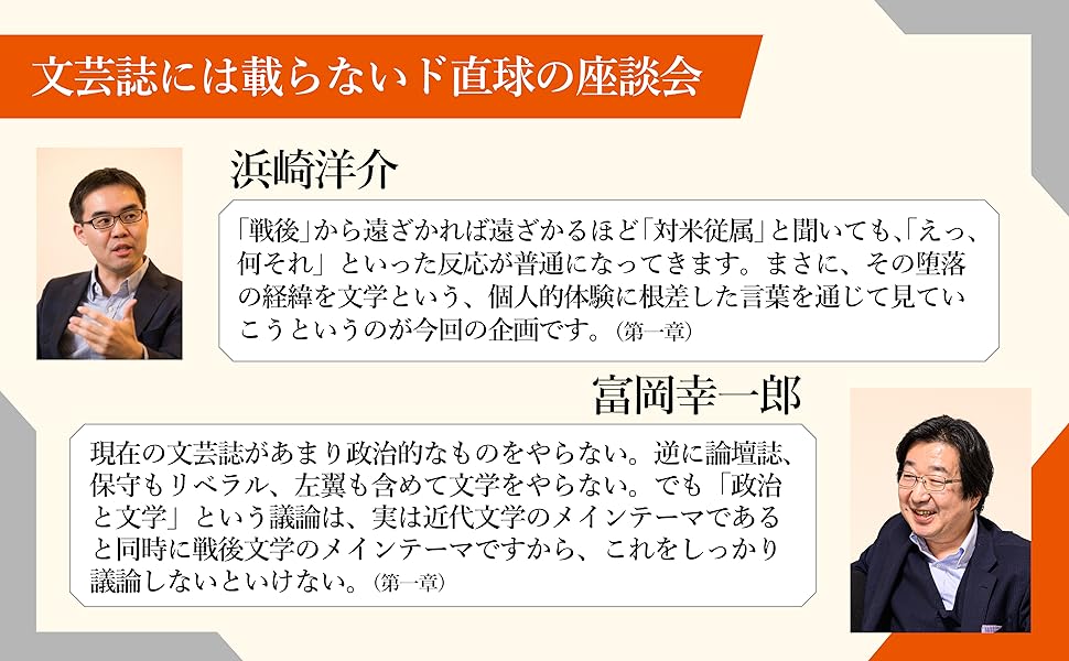 また、「対米従属」という明確な視点が全体を貫いており、戦後日本人の精神的な変遷を眺めることで、私たちの現在地を突き付けられるようだ。戦後には、まだ抵抗感を感じることができた「対米従属」という現実は、もはや自然なものとなってしまった。この現在地から、どのような一歩を踏み出すのかが問われている。とはいえ、本書は、この日本についての本質的で暗い問いを、明るくさらけ出し、絶望の果てから一歩を踏み出す力をくれる。第二部の評論も大変熱量があり、対談の補足として助けになる。」「分量は多く内容もしっかりしているので、全く高いと感じません。むしろ安い。内容は、第二次大戦終了後の戦後の日本人の精神の移り変わりについて、有名な文学の描写の解説と対談を通じてわかりやすく且つ面白おかしく理解できるものになっています。文学を一切知らない人でも十分楽しめる。爆笑必至。こんな本は今までなかったのでは?」