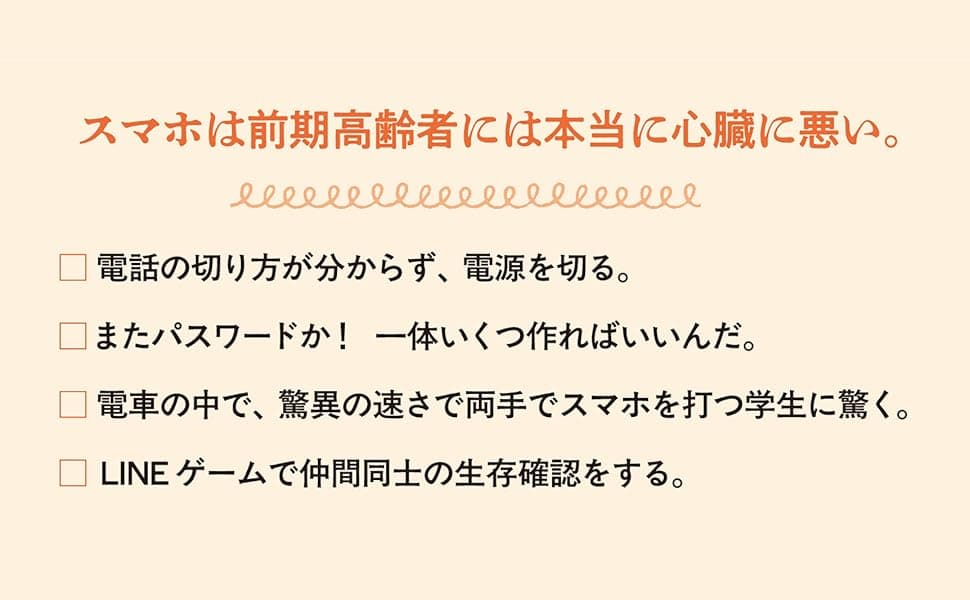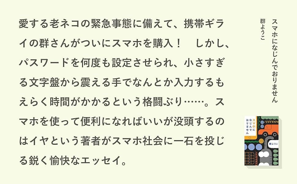 レストランで一緒に食事をしている家族が、それぞれスマホに見入っている光景を横目に見つつ、「スマホを使って便利になればいいが、没頭するのはイヤ」という著者が、スマホ社会に一石を投じる鋭く愉快なエッセイ。