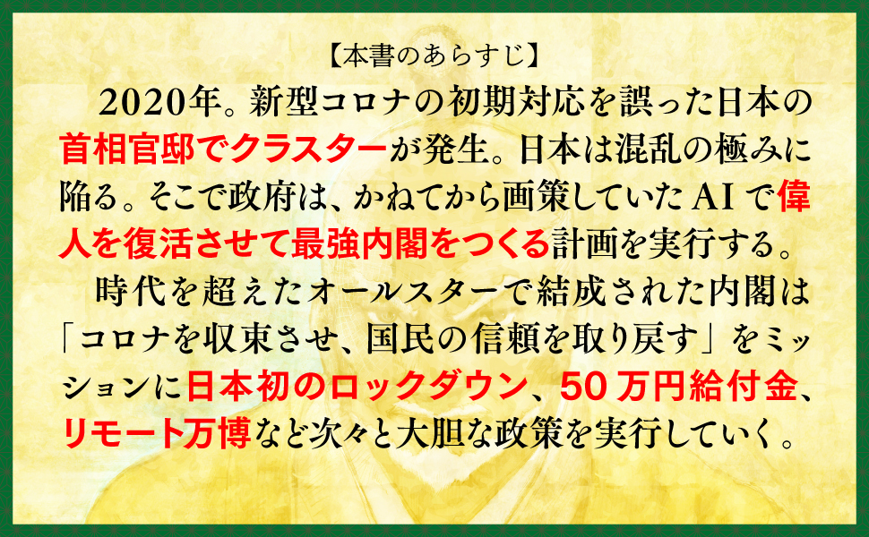 そんな歴史に名を刻む面々で組閣された最強内閣は、迅速な意思決定で、東京ロックダウン、50万円給付金、リモート国会、令和版楽市楽座、リモート万博など、大胆な政策を次々と実行していく。