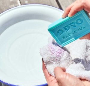 「ウタマロ石けん」は、汚れがひどいところに塗ってもみ洗いしてから洗濯機で洗うのが一般的な使い方です。