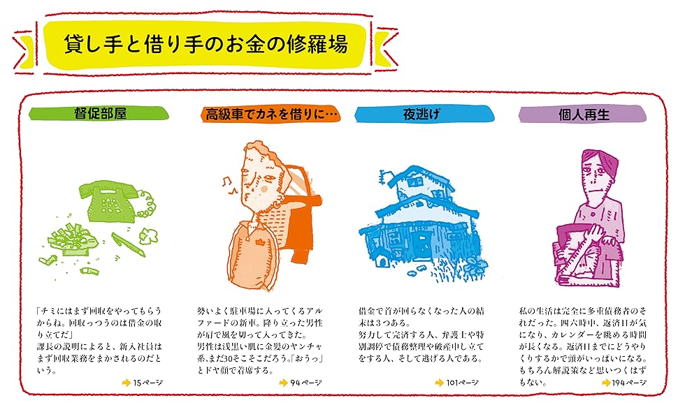 債務者の夜逃げや自殺など重い部分もある一方、クスリ・ホロリとさせる場面もあり、読みどころ満載。