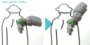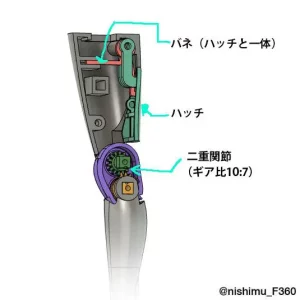 肩の背中側にもギアを配置し、肩甲骨の独特の動きを再現しています。お尻はトーションバネを使って、太ももと連動して可動する仕組みにしています。