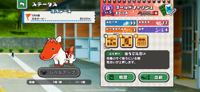 スタミナ値が低いのが懸念材料ではあったのですが、レースをこなすほどに値も上がりました。