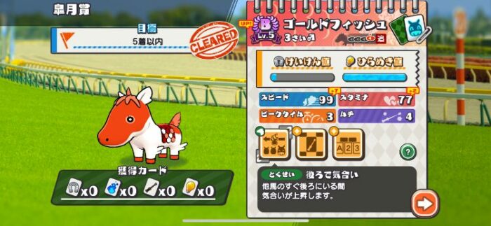 ということはやっぱりスタミナなのですが、カードアイテムはその場限りの増強剤みたいなものなので、基本的な部分の底上げはレースに勝って上げていくしかないようです。